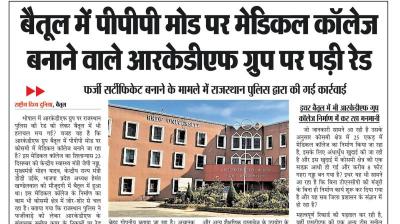 (बैतूल) बैतूल में पीपीपी मोड पर मेडिकल कॉलेज बनाने वाले आरकेडीएफ ग्रुप पर पड़ी रेड , - फर्जी सर्टीफिकेट बनाने के मामले में राजस्थान पुलिस द्वारा की गई कार्रवाई