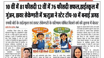 (बैतूल) 10 वीं में 81 फीसदी 12 वीं में 76 फीसदी सफल,हाईस्कूल में गुंजन, हायर सेकेण्डरी में ऋतुजा ने स्टेट टॉप-10 में बनाई जगह , - एमपी बोर्ड के हाईस्कूल एवं हायर सेकेण्डरी के परिणाम घोषित पिछले वर्ष की तुलना में बेहतर