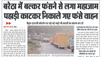 (बैतूल) बरेठा में बल्कर फंसने से लगा महाजाम , पहाड़ी काटकर निकाले गए फंसे वाहन - बैतूल-इटारसी फोरलेन पर बड़े-बड़े गढ्डे भी हादसों का बन रहे कारण