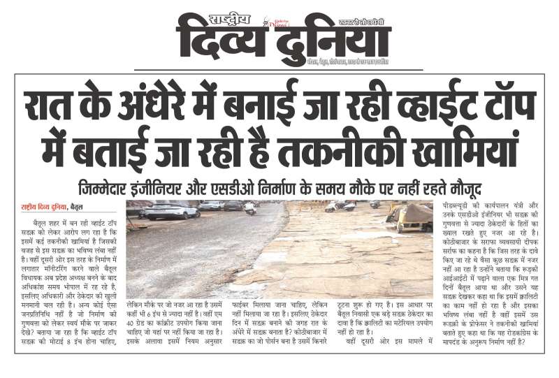 (बैतूल) रात के अंधेरे में बनाई जा रही व्हाईट टॉप में बताई जा रही है तकनीकी खामियां , - जिम्मेदार इंजीनियर और एसडीओ निर्माण के समय मौके पर नहीं रहते मौजूद