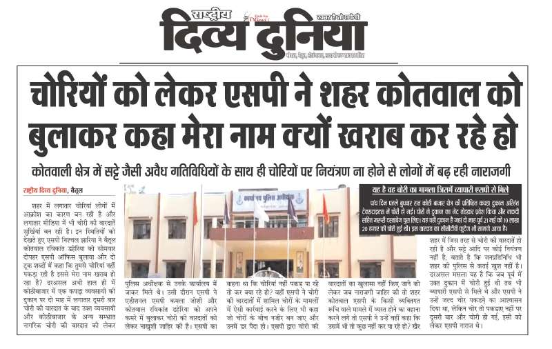 (बैतूल) चोरियों को लेकर एसपी ने शहर कोतवाल को बुलाकर कहा मेरा नाम क्यों खराब कर रहे हो , - कोतवाली क्षेत्र में सट्टे जैसी अवैध गतिविधियों के साथ ही चोरियों पर नियंत्रण ना होने से लोगों में बढ़ रही नाराजगी