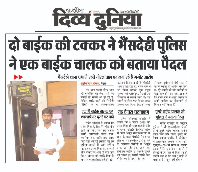 (बैतूल) दो बाईक की टक्कर ने भैंसदेही पुलिस ने एक बाईक चालक को बताया पैदल , - भैंसदेही थाना प्रभारी रहते नीरज पाल पर लग रहे है गंभीर आरोप