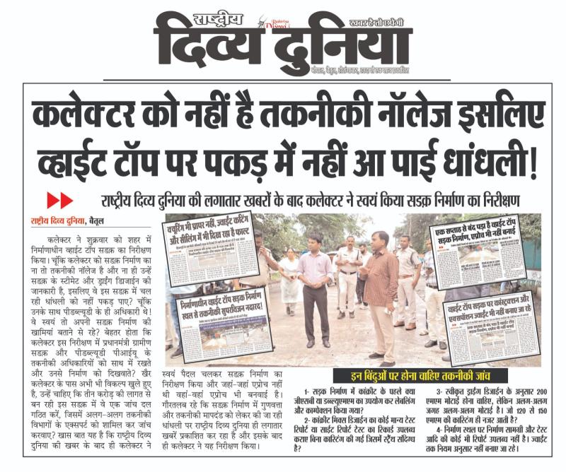 (बैतूल) कलेक्टर को नहीं है तकनीकी नॉलेज इसलिए व्हाईट टॉप पर पकड़ में नहीं आ पाई धांधली..! , - राष्ट्रीय दिव्य दुनिया की लगातार खबरों के बाद कलेक्टर ने स्वयं किया सडक़ निर्माण का निरीक्षण
