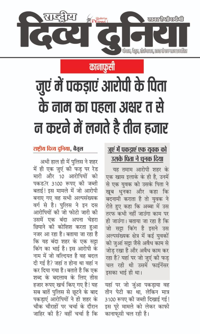 बैतूल। अभी हाल ही में पुलिस ने शहर में ही एक जुएं की फड़ पर रेड मारी और 10 आरोपियों को पकडक़र 3100 रूपए की जब्ती बताई! इस मामले में जो आरोपी बनाए गए वह सभी अल्पसंख्यक वर्ग से है। पुलिस ने इन दस आरोपियों की जो फोटो जारी की उसमें एक बंदा अपना चेहरा छिपाने की कोशिश करता हुआ नजर आ रहा है। बताया जा रहा है कि यह बंदा शहर के एक सट्टा किंग का भाई है। इस आरोपी के नाम में जो वल्दियत है वह बदल दी गई है? जहां त होना था वहां न कर दिया गया है। बताते है कि एक शब्द के बदलाव के लिए तीस हजार रूपए खर्च किए गए है! यह सब बातें पुलिस से छूटने के बाद पकड़ाएं आरोपियों ने ही शहर के चौक चौराहों पर चर्चा के दौरान जाहिर की है? वहीं चर्चा है कि यहां पर जो जुंआ पकड़ाया वह तीन पेटी का था, लेकिन मात्र 3100 रूपए की जब्ती दिखाई गई! इस पूरे मामले को लेकर काफी कानाफूसी चल रही है।