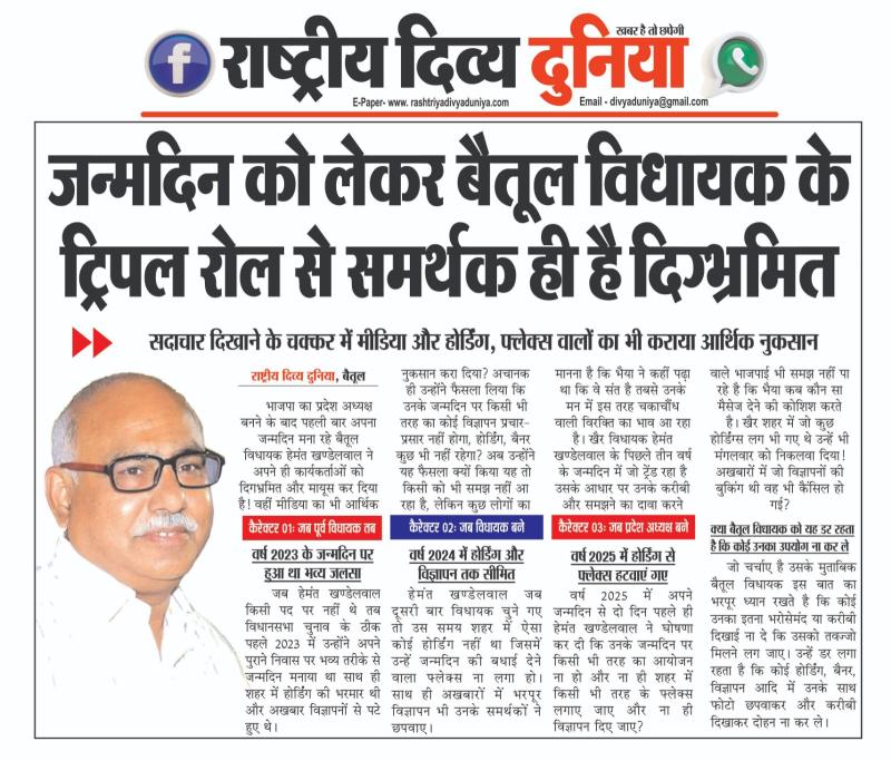 (बैतूल) जन्मदिन को लेकर बैतूल विधायक के ट्रिपल रोल से समर्थक ही है दिग्भ्रमित , - सदाचार दिखाने के चक्कर में मीडिया और होर्डिंग, फ्लेक्स वालों का भी कराया आर्थिक नुकसान