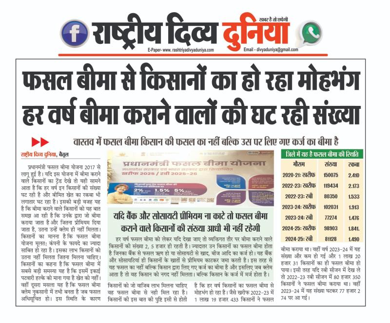 (बैतूल) फसल बीमा से किसानों का हो रहा मोहभंग हर वर्ष बीमा कराने वालों की घट रही संख्या , - वास्तव में फसल बीमा किसान की फसल का नहीं बल्कि उस पर लिए गए कर्ज का है बीमा