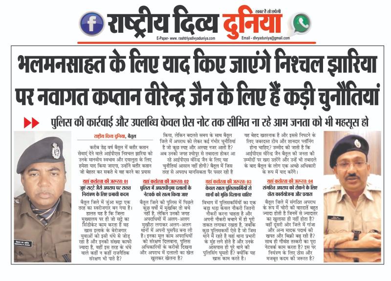 (बैतूल) भलमनसाहत के लिए याद किए जाएंगे निश्चल झारिया पर नवागत कप्तान वीरेन्द्र जैन के लिए हैं कड़ी चुनौतियां , - पुलिस की कार्रवाई और उपलब्धि केवल प्रेस नोट तक सीमित ना रहे आम जनता को भी महसूस हो