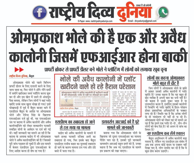 (बैतूल) ओमप्रकाश भोले की है एक और अवैध कालोनी जिसमें एफआईआर होना बाकी , - प्रापर्टी ब्रोकर से प्रापर्टी डीलर बने भोले ने प्लॉटिंग में लोगों को लगाया खूब चूना