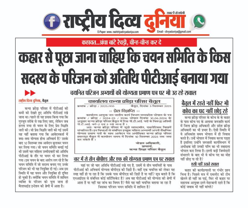 बैतूल(हेडलाइन)/नवल वर्मा। कन्या क्रीड़ा परिसर में पीटीआई की कमी को देखते हुए अतिथि पीटीआई रखे जाना था। पहले तो यह प्रयास किया गया कि गुपचुप तरीके से रख लिए जाए, लेकिन जब हल्ला मचा तो चयन के लिए प्रेस विज्ञप्ति जारी की। जो प्रेस विज्ञप्ति जारी की गई उसमें यह नहीं बताया गया कि आवेदनकर्ता में क्या-क्या योग्यता होना अनिवार्य है? उसके बाद 10 सितम्बर तक आवेदन बुलाकर चयन कर लिया गया। जो चयन समिति बनाई गई थी उसमें चार महिला उम्मीदवारों को अतिथि पीटीआई के तौर पर चयन भी कर लिया गया। इस चयन के बाद आरोप लग रहे है कि चयन समिति में जो सदस्य बनाए गए उनके परिजन को भी यह नियुक्ति दी गई। अब इस स्थिति में यह चयन और नियुक्ति ही दूषित हो चुकी है। क्योंकि चयन समिति में शामिल व्यक्ति के परिजन को चुना जाना ही मैलाफाईड इन्टेशन की श्रेणी में आता है।