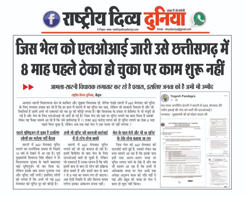 (बैतूल) जिस भेल को एलओआई जारी उसे छत्तीसगढ़ में 8 माह पहले ठेका हो चुका पर काम शुरू नहीं , - आमला-सारनी विधायक लगातार कर रहे है प्रयास, इसलिए जनता को है अभी भी उम्मीद