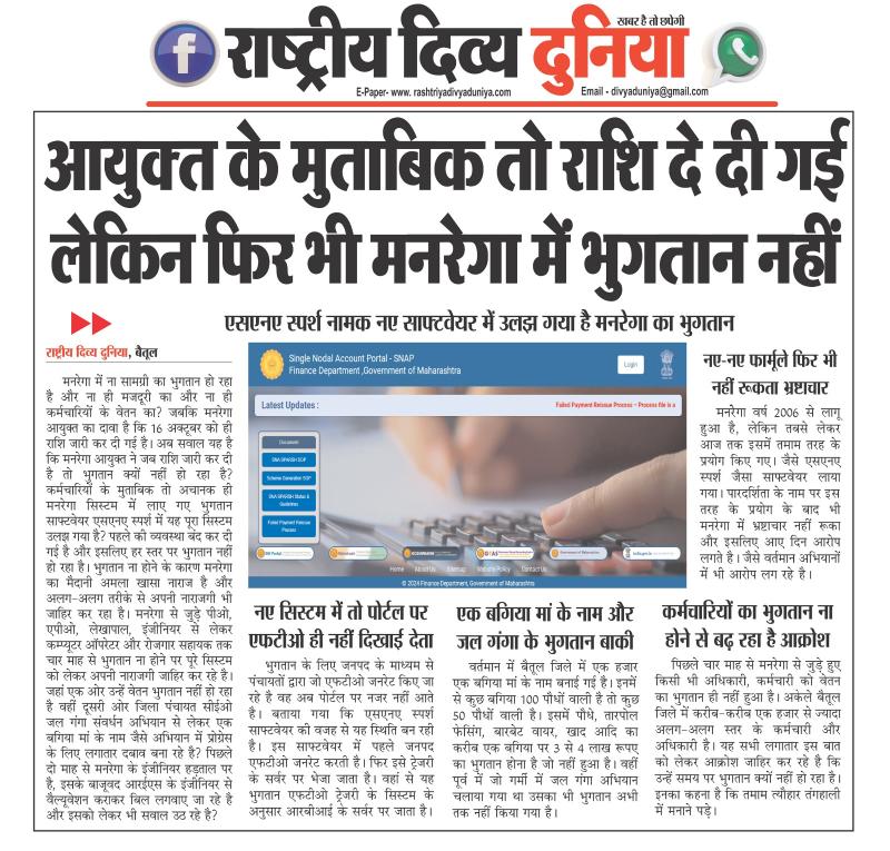 (बैतूल) आयुक्त के मुताबिक तो राशि दे दी गई लेकिन फिर भी मनरेगा में भुगतान नहीं , - एसएनए स्पर्श नामक नए साफ्टवेयर में उलझ गया है मनरेगा का भुगतान