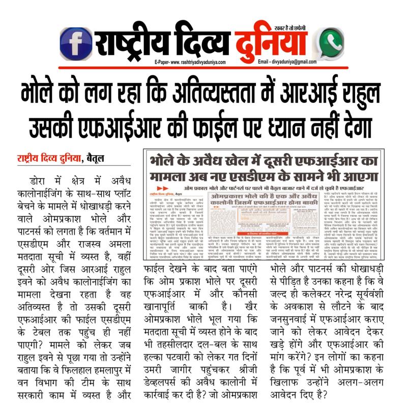 बैतूल(हेडलाइन)/नवल वर्मा। बडोरा में क्षेत्र में अवैध कालोनाईजिंग के साथ-साथ प्लॉट बेचने के मामले में धोखाधड़ी करने वाले ओमप्रकाश भोले और पाटनर्स को लगता है कि वर्तमान में एसडीएम और राजस्व अमला मतदाता सूची में व्यस्त है, वहीं दूसरी ओर जिस आरआई राहुल इवने को अवैध कालोनाईजिंग का मामला देखना रहता है वह अतिव्यस्त है तो उसकी दूसरी एफआईआर की फाईल एसडीएम के टेबल तक पहुंच ही नहीं पाएगी? मामले को लेकर जब राहुल इवने से पूछा गया तो उन्होंने बताया कि वे फिलहाल हमलापुर में वन विभाग की टीम के साथ सरकारी काम में व्यस्त है और फाईल देखने के बाद बता पाएंगे कि ओम प्रकाश भोले पर दूसरी एफआईआर में और कौनसी खानापूर्ति बाकी है। खैर ओमप्रकाश भोले भूल गया कि मतदाता सूची में व्यस्त होने के बाद भी तहसीलदार दल-बल के साथ हल्का पटवारी को लेकर गत दिनों उमरी जागीर पहुंचकर श्रीजी डेव्हलपर्स की अवैध कालोनी में कार्रवाई कर दी है? जो ओमप्रकाश भोले और पाटनर्स की धोखाधड़ी से पीडि़त है उनका कहना है कि वे जल्द ही कलेक्टर नरेन्द्र सूर्यवंशी के अवकाश से लौटने के बाद जनसुनवाई में एफआईआर कराए जाने को लेकर आवेदन देकर खड़े होंगे और एफआईआर की मांग करेंगे? इन लोगों का कहना है कि पूर्व में भी ओमप्रकाश के खिलाफ उन्होंने अलग-अलग आवेदन दिए है?
