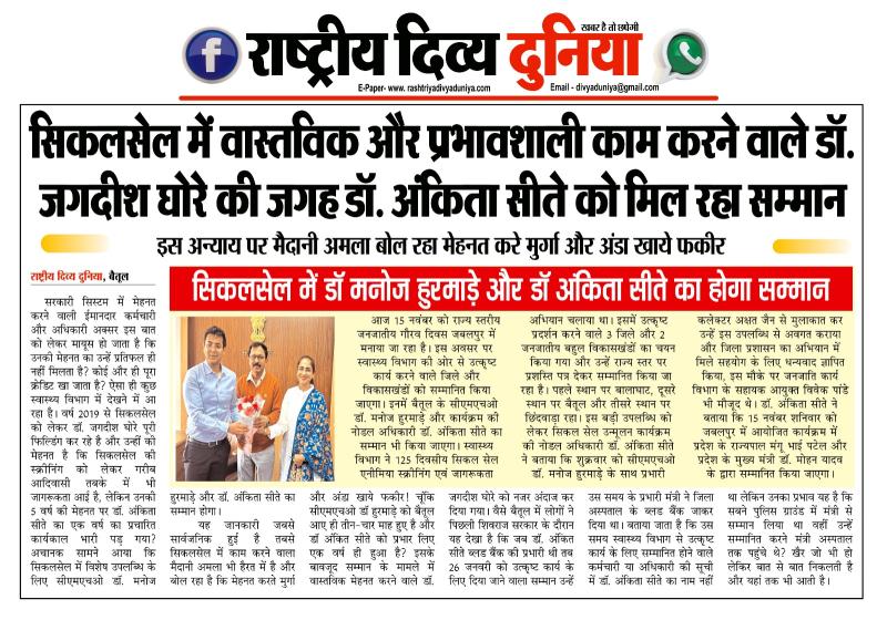 - सिकलसेल में डॉ मनोज हुरमाड़े और डॉ अंकिता सीते का होगा सम्मान...