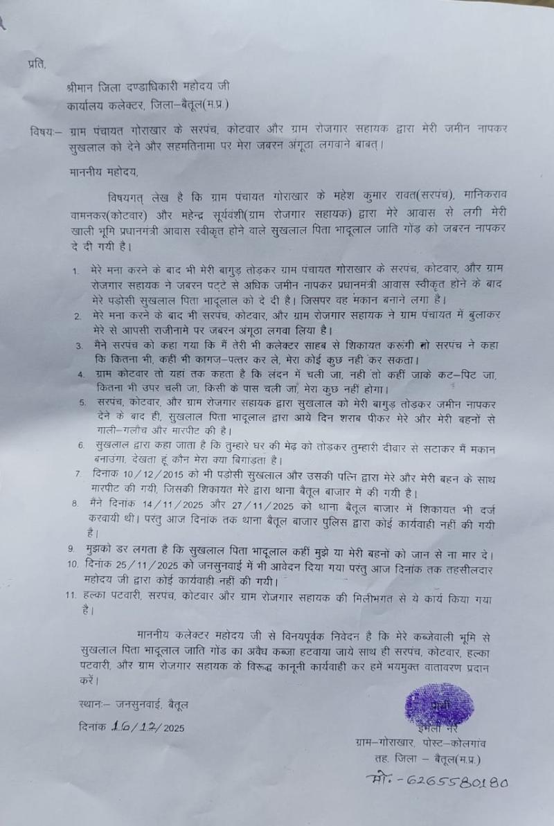 (बैतूल) प्रधानमंत्री आवास के नाम पर निजी भूमि नापने का आरोप, - पीड़िता ने प्रशासन से कार्रवाई की मांग की , - जनसुनवाई में पहुंची जमीन विवाद की शिकायत, - पंचायत पदाधिकारियों पर गंभीर आरोप