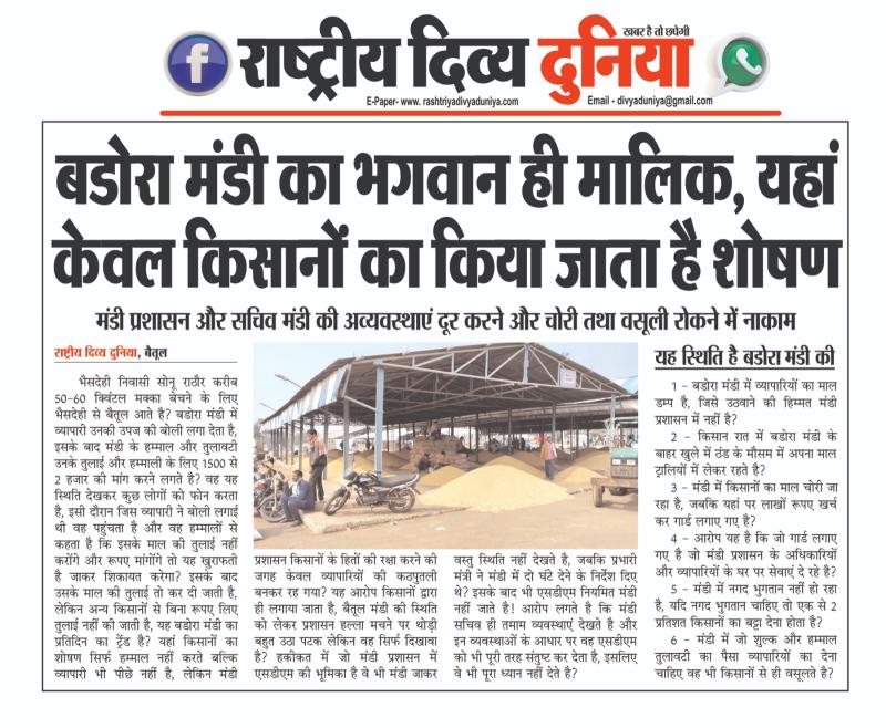 (बैतूल) बडोरा मंडी का भगवान ही मालिक, यहां केवल किसानों का किया जाता है शोषण , - मंडी प्रशासन और सचिव मंडी की अव्यवस्थाएं दूर करने और चोरी तथा वसूली रोकने में नाकाम