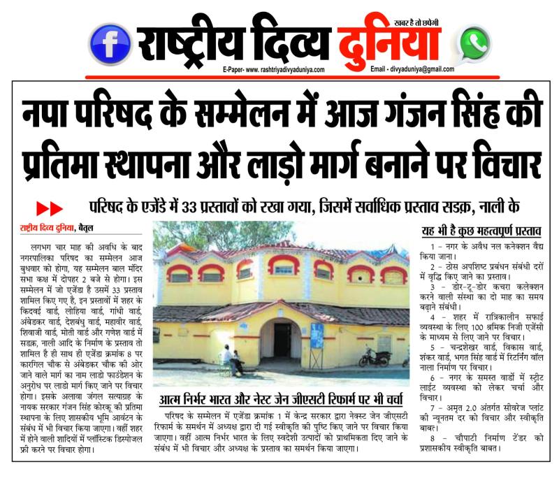(बैतूल) नपा परिषद के सम्मेलन में आज गंजन सिंह की प्रतिमा स्थापना और लाड़ो मार्ग बनाने पर विचार , - परिषद के एजेंडे में 33 प्रस्तावों को रखा गया, जिसमें सर्वाधिक प्रस्ताव सडक़, नाली के