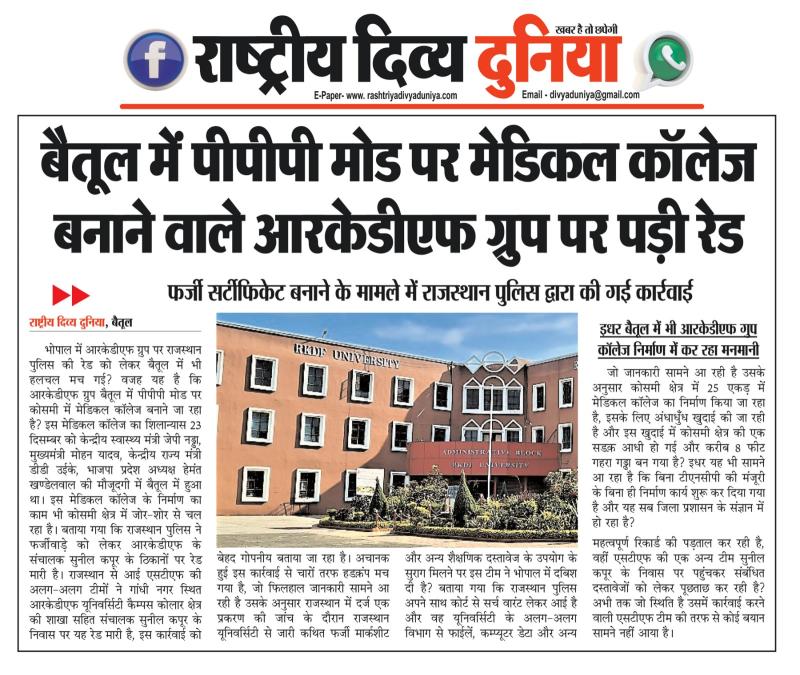बैतूल(हेडलाइन)/नवल वर्मा। भोपाल में आरकेडीएफ ग्रुप पर राजस्थान पुलिस की रेड को लेकर बैतूल में भी हलचल मच गई? वजह यह है कि आरकेडीएफ ग्रुप बैतूल में पीपीपी मोड पर कोसमी में मेडिकल कॉलेज बनाने जा रहा है? इस मेडिकल कॉलेज का शिलान्यास 23 दिसम्बर को केन्द्रीय स्वास्थ्य मंत्री जेपी नड्डा, मुख्यमंत्री मोहन यादव, केन्द्रीय राज्य मंत्री डीडी उईके, भाजपा प्रदेश अध्यक्ष हेमंत खण्डेलवाल की मौजूदगी में बैतूल में हुआ था। इस मेडिकल कॉलेज के निर्माण का काम भी कोसमी क्षेत्र में जोर-शोर से चल रहा है। बताया गया कि राजस्थान पुलिस ने फर्जीवाड़े को लेकर आरकेडीएफ के संचालक सुनील कपूर के ठिकानों पर रेड मारी है। राजस्थान से आई एसटीएफ की अलग-अलग टीमों ने गांधी नगर स्थित आरकेडीएफ यूनिवर्सिटी कैम्पस कोलार क्षेत्र की शाखा सहित संचालक सुनील कपूर के निवास पर यह रेड मारी है, इस कार्रवाई को बेहद गोपनीय बताया जा रहा है। अचानक हुई इस कार्रवाई से चारों तरफ हडक़ंप मच गया है, जो फिलहाल जानकारी सामने आ रही है उसके अनुसार राजस्थान में दर्ज एक प्रकरण की जांच के दौरान राजस्थान यूनिवर्सिटी से जारी कथित फर्जी मार्कशीट और अन्य शैक्षणिक दस्तावेज के उपयोग के सुराग मिलने पर इस टीम ने भोपाल में दबिश दी है? बताया गया कि राजस्थान पुलिस अपने साथ कोर्ट से सर्च वारंट लेकर आई है और वह यूनिवर्सिटी के अलग-अलग विभाग से फाईलें, कम्प्यूटर डेटा और अन्य महत्वपूर्ण रिकार्ड की पड़ताल कर रही है, वहीं एसटीएफ की एक अन्य टीम सुनील कपूर के निवास पर पहुंचकर संबंधित दस्तावेजों को लेकर पूछताछ कर रही है? अभी तक जो स्थिति है उसमें कार्रवाई करने वाली एसटीएफ टीम की तरफ से कोई बयान सामने नहीं आया है।