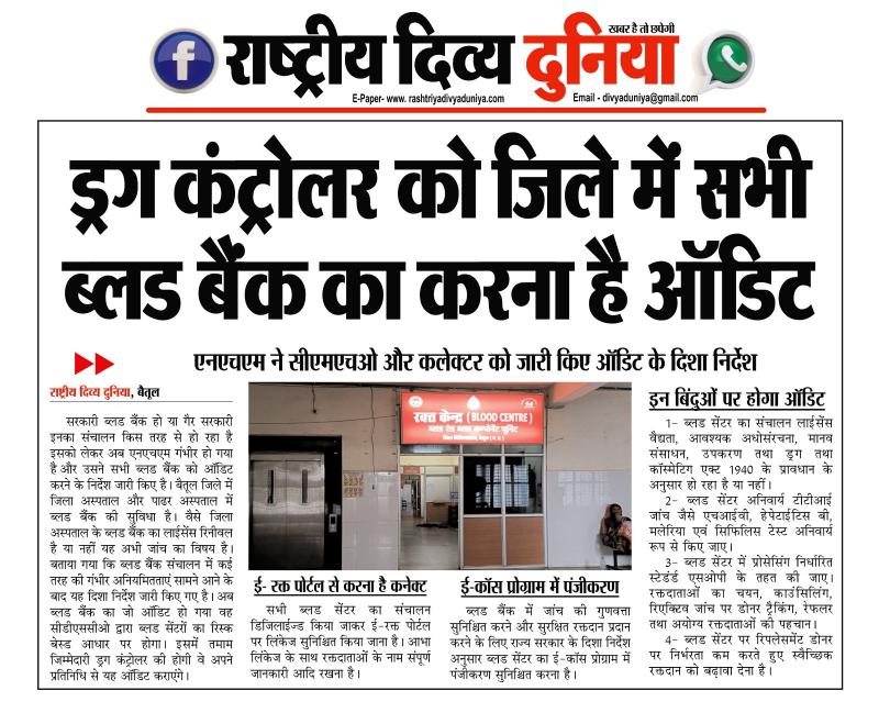 (बैतूल) ड्रग कंट्रोलर को जिले में सभी ब्लड बैंक का करना है ऑडिट , - एनएचएम ने सीएमएचओ और कलेक्टर को जारी किए ऑडिट के दिशा निर्देश
