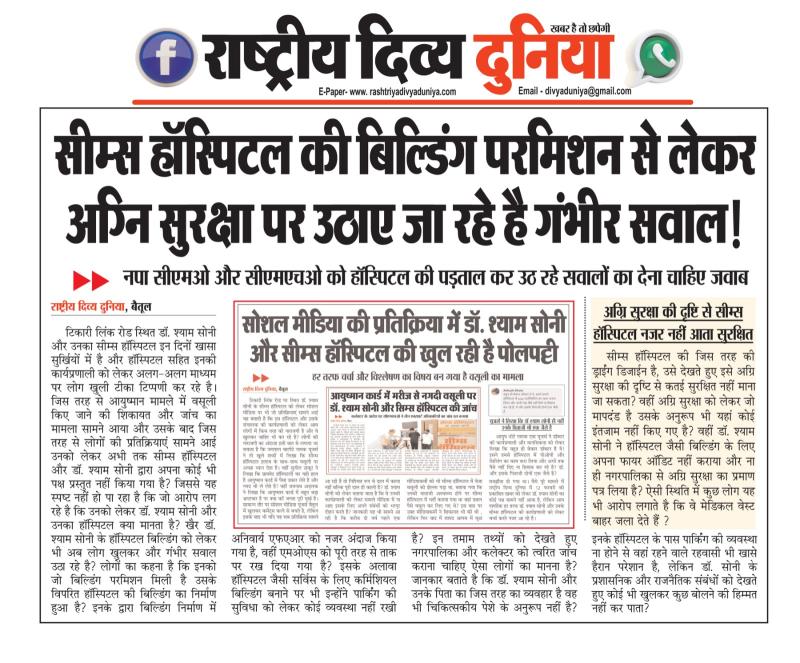 (बैतूल) सीम्स हॉस्पिटल की बिल्डिंग परमिशन से लेकर अग्नि सुरक्षा पर उठाए जा रहे है गंभीर सवाल..! - नपा सीएमओ और सीएमएचओ को हॉस्पिटल की पड़ताल कर उठ रहे सवालों का देना चाहिए जवाब..?