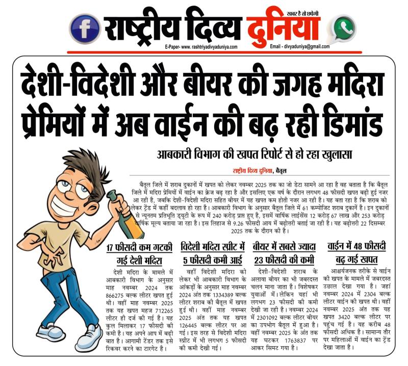 बैतूल (हेडलाइन) / नवल वर्मा। बैतूल जिले में शराब दुकानों में खपत को लेकर नवम्बर 2025 तक का जो डेटा सामने आ रहा है वह बताता है कि बैतूल जिले में मदिरा प्रेमियों में वाईन का क्रेज बढ़ रहा है और इसलिए एक वर्ष के दौरान लगभग 48 फीसदी खपत बढ़ी हुई नजर आ रही है, जबकि देशी-विदेशी मदिरा सहित बीयर में यह खपत कम होती नजर आ रही है। यह बता रहा है कि शराब को लेकर ट्रेंड में कहीं बदलाव हो रहा है। आबकारी विभाग के अनुसार बैतूल जिले में 61 कम्पोजिट शराब दुकानें है, इन दुकानों से न्यूनतम प्रतिभूति ड्यूटी के रूप में 240 करोड़ प्राप्त हुए है, इसमें वार्षिक लाईसेंस 12 करोड़ 67 लाख और 253 करोड़ वार्षिक मूल्य बताया जा रहा है। इस लिहाज से 9.26 फीसदी आय में बढ़ोत्तरी बताई जा रही है। यह बढ़ोत्तरी 22 दिसम्बर 2025 तक के दौरान की है।