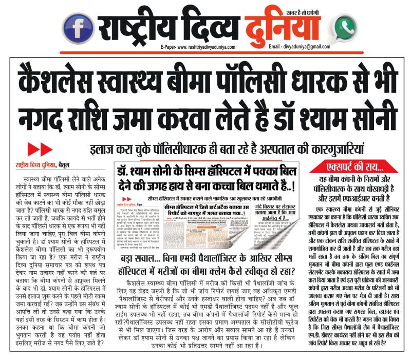 बैतूल(हेडलाइन)/नवल वर्मा। केशलेश स्वास्थ्य बीमा पॉलिसी लेने वाले अनेक लोगों ने बताया कि डॉ. श्याम सोनी के सीम्स हॉस्पिटल में स्वास्थ्य बीमा पॉलिसी धारक की जेब काटने का कोई मौका नहीं छोड़ा जाता है? पॉलिसी धारक से नगद राशि वसूल कर ली जाती है, जबकि कायदे से भर्ती होने के बाद पॉलिसी धारक से एक रूपया भी नहीं लिया जाना चाहिए, पूरा बिल बीमा कंपनी चुकाती है। डॉ. श्याम सोनी के हॉस्पिटल में कैशलेस बीमा पॉलिसी का भी दुरूपयोग किया जा रहा है? एक मरीज ने राष्ट्रीय दिव्य दुनिया समाचार पत्र को शपथ पत्र देकर नाम ना उजागर करने की शर्त पर बताया कि बीमा कंपनी से बीमा कंपनी से अप्रूवल मिलने के बाद भी डॉ. श्याम सोनी के हॉस्पिटल में उनसे इलाज शुरू करने के पहले मोटी रकम जमा करवाई गई ? जब उन्होंने इस संबंध में आपत्ति ली तो उनसे कहा गया कि उनसे नगद लिए रूपये वापस कर देते हैं? उन्होंने बताया कि बीमा कंपनी जो भुगतान करती है वह पर्याप्त नहीं होता इसलिए मरीज से नगद पैसे लिए जाते हैं?