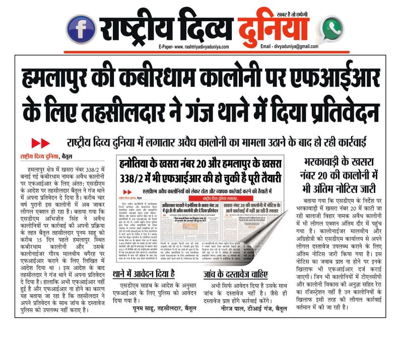 (बैतूल) हमलापुर की कबीरधाम कालोनी पर एफआईआर के लिए तहसीलदार ने गंज थाने में दिया प्रतिवेदन , - राष्ट्रीय दिव्य दुनिया में लगातार अवैध कालोनी का मामला उठाने के बाद हो रही कार्रवाई