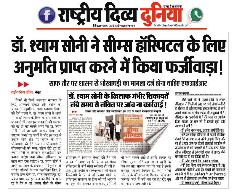(बैतूल) डॉ. श्याम सोनी ने सीम्स हॉस्पिटल के लिए अनुमति प्राप्त करने में किया फर्जीवाड़ा! - साफ तौर पर शासन से धोखाधड़ी का मामला दर्ज होना चाहिए एफआईआर