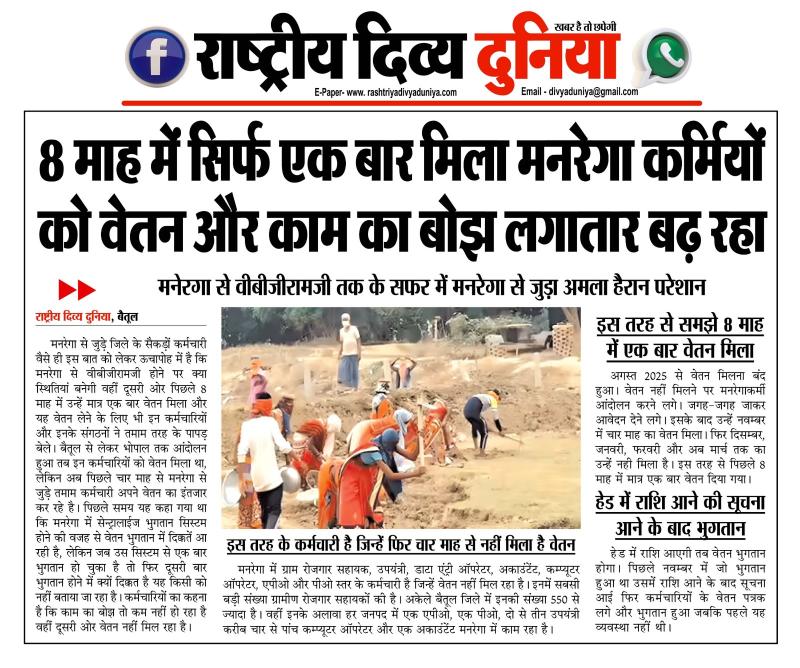 (बैतूल) 8 माह में सिर्फ एक बार मिला मनरेगा कर्मियों को वेतन और काम का बोझ लगातार बढ़ रहा , - मनेरगा से वीबीजीरामजी तक के सफर में मनरेगा से जुड़ा अमला हैरान परेशान