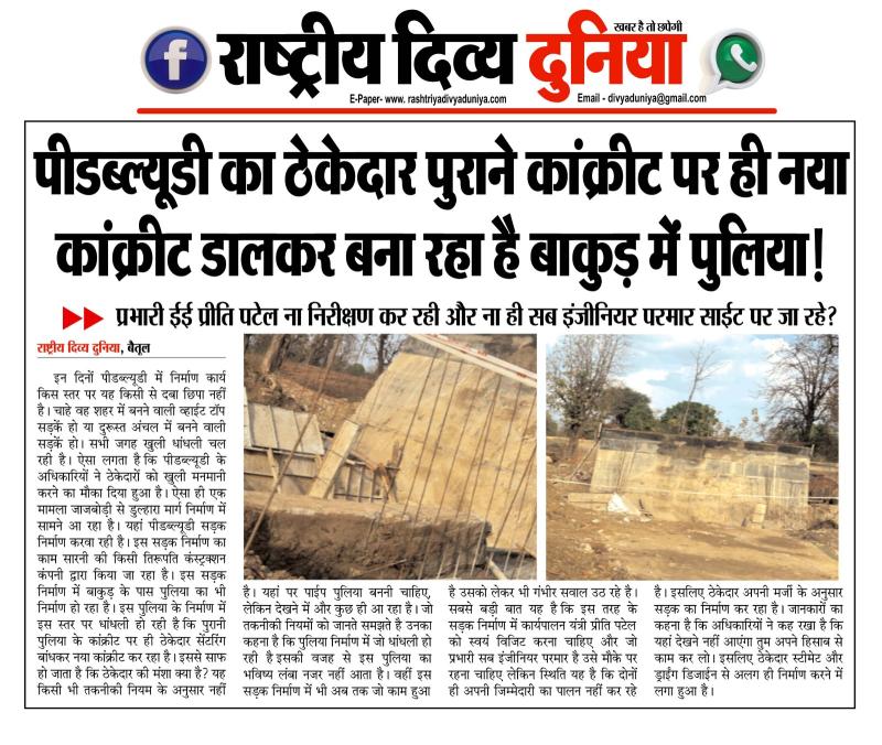 (बैतूल) पीडब्ल्यूडी का ठेकेदार पुराने कांक्रीट पर ही नया कांक्रीट डालकर बना रहा है बाकुड़ में पुलिया..! , - प्रभारी ई. ई. प्रीति पटेल ना निरीक्षण कर रही और ना ही सब इंजीनियर परमार साईट पर जा रहे..?