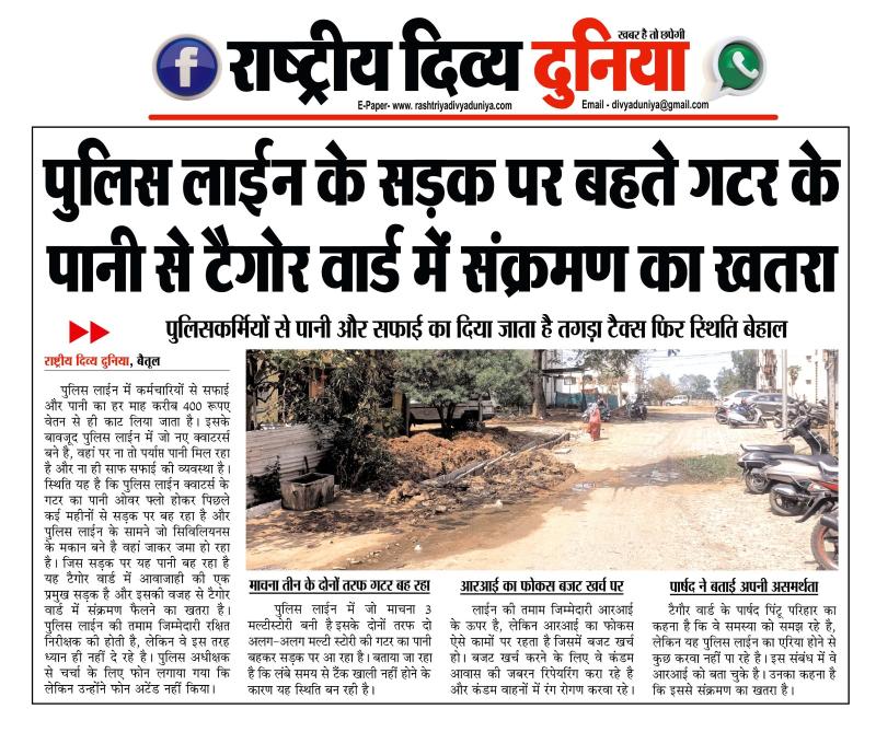 (बैतूल) पुलिस लाईन के सडक़ पर बहते गटर के पानी सेे टैगोर वार्ड में संक्रमण का खतरा , - पुलिसकर्मियों से पानी और सफाई का लिया जाता है तगड़ा टैक्स फिर स्थिति बेहाल