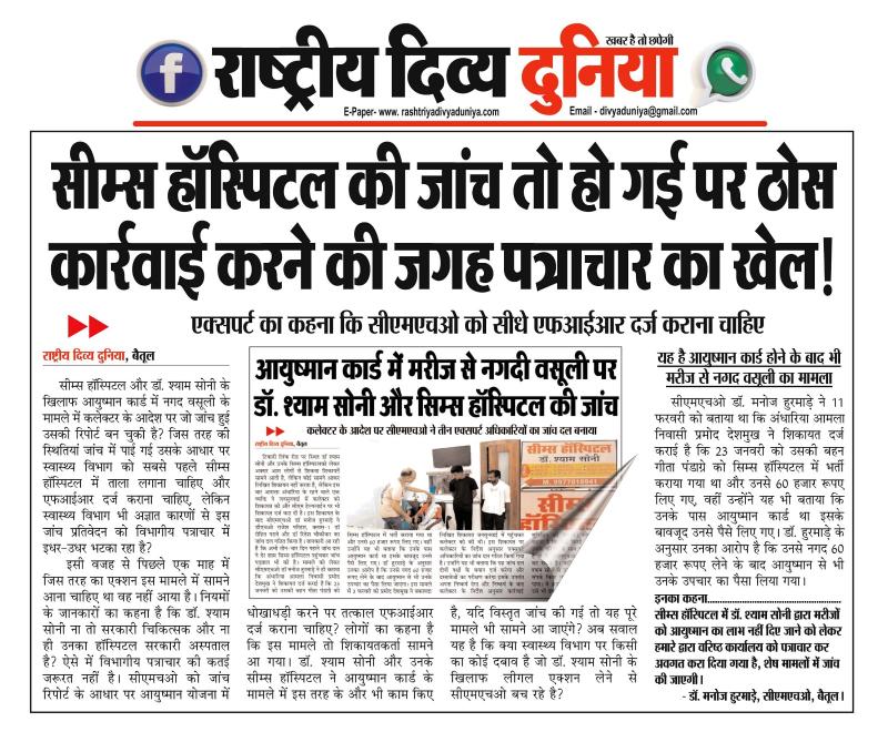सीएमएचओ डॉ. मनोज हुरमाड़े ने 11 फरवरी को बताया था कि अंधारिया आमला निवासी प्रमोद देशमुख ने शिकायत दर्ज कराई है कि 23 जनवरी को उसकी बहन गीता पंडाग्रे को सिम्स हॉस्पिटल में भर्ती कराया गया था और उनसे 60 हजार रूपए लिए गए, वहीं उन्होंने यह भी बताया कि उनके पास आयुष्मान कार्ड था इसके बावजूद उनसे पैसे लिए गए। डॉ. हुरमाड़े के अनुसार उनका आरोप है कि उनसे नगद 60 हजार रूपए लेने के बाद आयुष्मान से भी उनके उपचार का पैसा लिया गया।