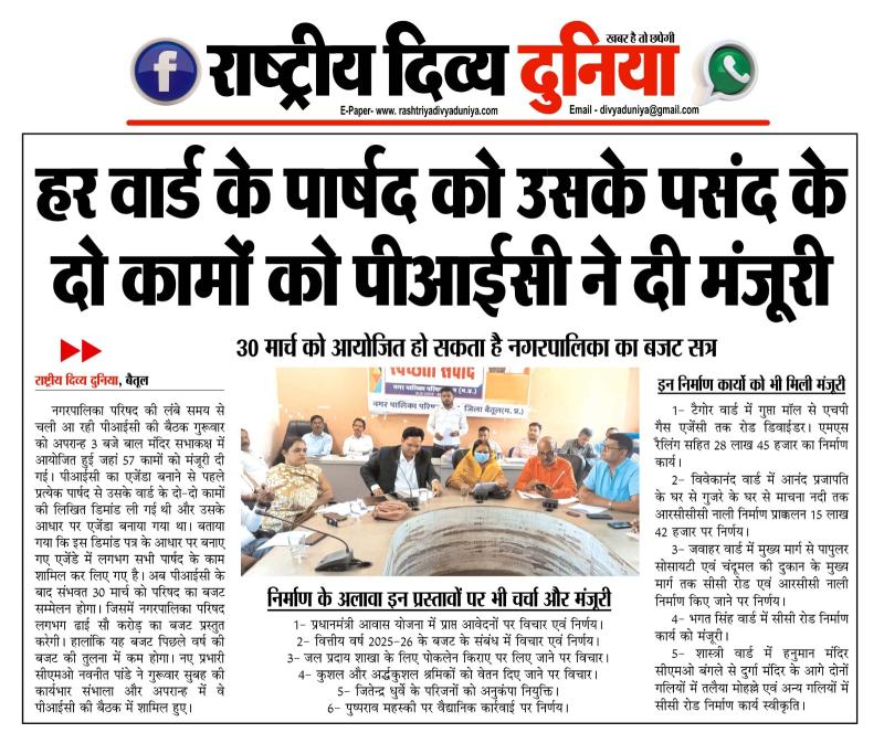 (बैतूल) हर वार्ड के पार्षद को उसके पसंद के दो कामों को पीआईसी ने दी मंजूरी , - 30 मार्च को आयोजित हो सकता है नगरपालिका का बजट सत्र