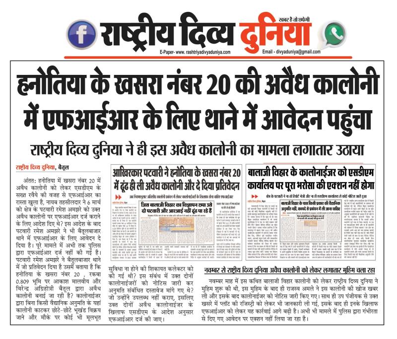 (बैतूल) हनोतिया के खसरा नंबर 20 की अवैध कालोनी में एफआईआर के लिए थाने में आवेदन पहुंचा , - राष्ट्रीय दिव्य दुनिया ने ही इस अवैध कालोनी का मामला लगातार उठाया