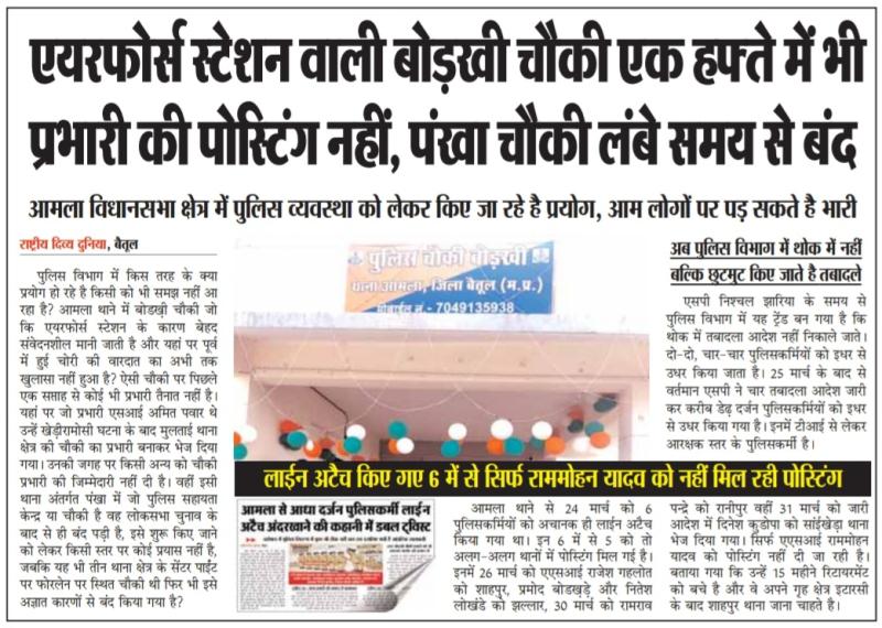 (बैतूल) एयरफोर्स स्टेशन वाली बोडख़ी चौकी एक हफ्ते में भी प्रभारी की पोस्टिंग नहीं, पंखा चौकी लंबे समय से बंद , - आमला विधानसभा क्षेत्र में पुलिस व्यवस्था को लेकर किए जा रहे है प्रयोग, आम लोगों पर पड़ सकते है भारी