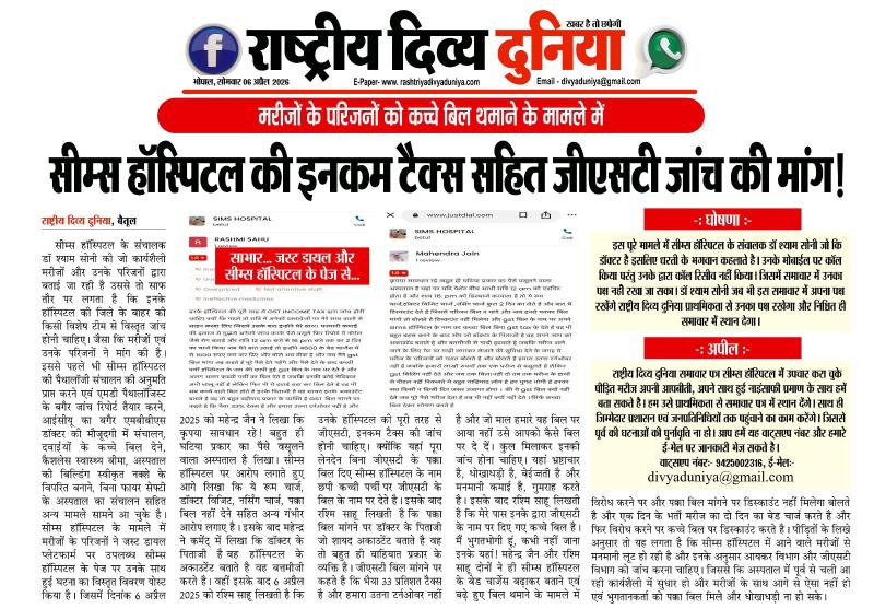 (बैतूल) मरीजों के परिजनों को कच्चे बिल थमाने के मामले में सीम्स हॉस्पिटल की इनकम टैक्स सहित जीएसटी जांच की मांग..!