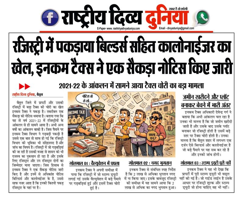 बैतूल(हेडलाइन)/नवल वर्मा। बैतूल जिले में प्रापर्टी और उसकी रजिस्ट्री में बड़ा टैक्स की चोरी का खेल इनकम टैक्स ने पकड़ा है? तकरीबन एक सैकड़ा को नोटिस थमाया है। बताया गया कि यह तो वर्ष 2021-22 में रजिस्ट्रीयों के आंकलन से ही सामने आया है? अभी अन्य वर्षो का आंकलन बाकी है। जिस पैमाने पर इनकम टैक्स विभाग ने गड़बड़ी पकड़ी है उससे एक बात तो साफ हो गई कि रजिस्ट्री विभाग की भूमिका भी संदेहास्पद है और जांच का विषय है? रजिस्ट्री में जो गड़बडिय़ां की जा रही है उसकी वजह से शासन को भी राजस्व का नुकसान हो रहा है और इसके लिए रजिस्ट्रार और उप रजिस्ट्रार दोनों को जिम्मेदार माना जाएगा? जिस हिसाब से इनकम टैक्स ने एक सैकड़ा नोटिस जारी किए है और इनमें से अधिकांश नोटिस बिल्डिर्स और कालोनाईजर के है, उससे साफ नजर आता है कि इनकी कितनी पकड़ रजिस्ट्रार के यहां पर है।