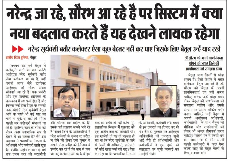 (बैतूल) नरेन्द्र जा रहे, सौरभ आ रहे है पर सिस्टम में क्या नया बदलाव करते हैं यह देखने लायक रहेगा , - नरेन्द्र सूर्यवंशी बतौर कलेक्टर ऐसा कुछ बेहतर नहीं कर पाए जिसके लिए बैतूल उन्हें याद रखे