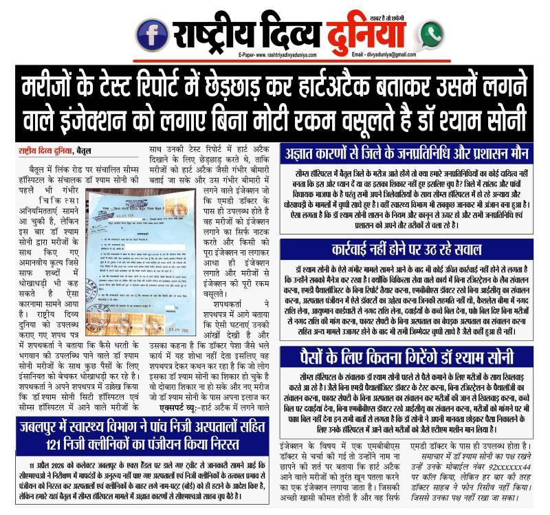 बैतूल (हेडलाइन)/नवल वर्मा। बैतूल में लिंक रोड पर संचालित सीम्स हॉस्पिटल के संचालक डॉ. श्याम सोनी की पहलेे भी गंभीर चिकित्सा अनियमितताएं सामने आ चुकी है, लेकिन इस बार डॉ. श्याम सोनी द्वारा मरीजों के साथ किए गए अमानवीय कृत्य जिसे साफ शब्दों में धोखाधड़ी भी कह सकते है ऐसा कारनामा सामने आया है? राष्ट्रीय दिव्य दुनिया को उपलब्ध कराए गए एक शपथ पत्र में शपथकर्ता ने बताया कि कैसे धरती के भगवान की उपलब्धि पाने वाले डॉ. श्याम सोनी मरीजों के साथ कुछ रुपयों के लिए इंसानियत को बेचकर धोखाधड़ी कर रहे है? शपथकर्ता ने अपने शपथपत्र में उल्लेख किया कि डॉ. श्याम सोनी सिटी हॉस्पिटल एवं सीम्स हॉस्पिटल में आने वाले मरीजों के साथ उनकी टेस्ट रिपोर्ट में हार्ट अटैक दिखाने के लिए छेड़छाड़ करते थे, ताकि मरीजों को हार्ट अटैक जैसी गंभीर बीमारी बताई जा सके और उस गंभीर बीमारी में लगने वाले इंजेक्शन जो कि एमडी डॉक्टर के पास ही उपलब्ध होते है वह मरीजों को इंजेक्शन लगाने का सिर्फ नाटक करते और किसी को भी पूरा इंजेक्शन ना लगाकर आधा ही इंजेक्शन लगाते और मरीजों से इंजेक्शन की पूरी रकम वसूलते?
