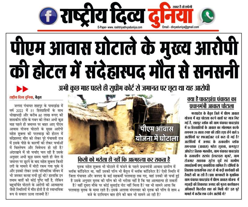 बैतूल(हेडलाइन)/नवल वर्मा। जनपद पंचायत शाहपुर के पावरझंडा में वर्ष 2022 में 51 हितग्राहियों के साथ धोखाधड़ी और करीब 80 लाख रूपए की शासकीय राशि के गबन को लेकर अभी कुछ माह पहले ही जमानत पर बाहर आए पीएम आवास योजना घोटाले के मुख्य आरोपी महेश शुक्ला की परतवाड़ा की होटल में संदेहास्पद मौत को लेकर पूरे पंचायती राज में इसके पीछे के कारणों को लेकर चर्चाओं में विश्लेषण और विवेचना हो रही है? अंदरखाने में जो चर्चाए चल रही है उसके अनुसार अभी कुछ समय पहले ही जेल से जमानत पर छूटने के बाद महेश शुक्ला किसी ठगी के मामले में मोटी रकम गवा चुके थे और इसको लेकर उनके परिवारिक जीवन में भी जमकर कलह मची हुई थी? हालाकि इन तमाम बातों की कोई पुष्टि नहीं है, लेकिन बहुचर्चित घोटाले के आरोपी की आत्महत्या जैसी स्थितियों में मौत होती है तो स्वाभाविक रूप से सवाल उठना लाजमी है?