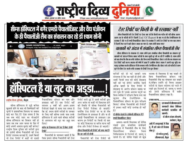 बैतूल(हेडलाइन)/नवल वर्मा। सीम्स हॉस्पिटल से जुड़े कथित खुलासे होने के बाद भी जिम्मेदारों की चुप्पी ने प्रशासनिक सिस्टम पर सवाल खड़े कर दिए है? ऐसा लगता है कि जब तक कोई शहर का वीआईपी सीम्स हॉस्पिटल का शिकार नहीं हो जाता तब तक आम जनता के हित में कोई अपनी आवाज बुलंद नहीं करेगा? राष्ट्रीय दिव्य दुनिया को मरीजों द्वारा जो दर्जनों सीम्स पैथालॉजी की टेस्ट रिपोर्ट उपलब्ध करवाई है, उसमें किसी भी टेस्ट रिपोर्ट में कहीं भी एमडी पैथालॉजिस्ट डॉक्टर का नाम और हस्ताक्षर नहीं है? एक रिपोर्ट नहीं लगभग 4 वर्षो की अलग-अलग रिपोटर्स देखने से साफ पता लगता है कि डॉ. श्याम सोनी मरीजों के उपचार के लिए नहीं बल्कि उनके पास उनके हॉस्पिटल में आने वाले बीमार मरीजों से अस्पताल को लूट का अड्डा बना दिया?