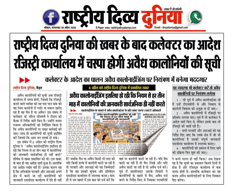 (बैतूल) राष्ट्रीय दिव्य दुनिया की खबर के बाद कलेक्टर का आदेश रजिस्ट्री कार्यालय में चस्पा होगी अवैध कालोनियों की सूची , - कलेक्टर के आदेश का पालन अवैध कालोनाईजिंग पर नियंत्रण में बनेगा मददगार