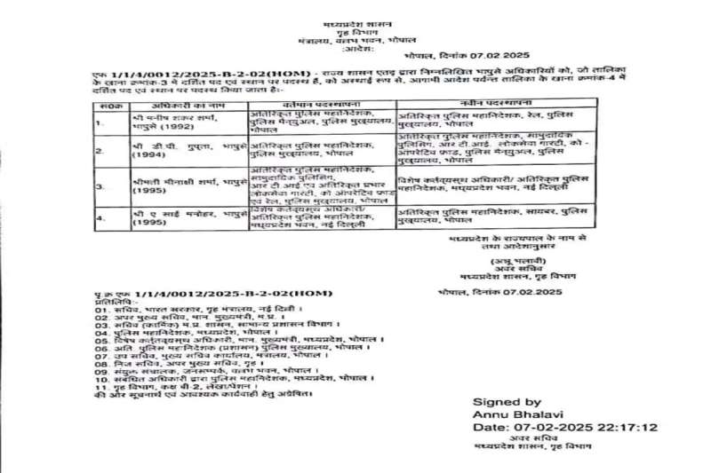 एमपी: वरिष्ठ आईपीएस अफसरों के तबादले, ए साई मनोहर एडीजी साइबर सेल नियुक्त
