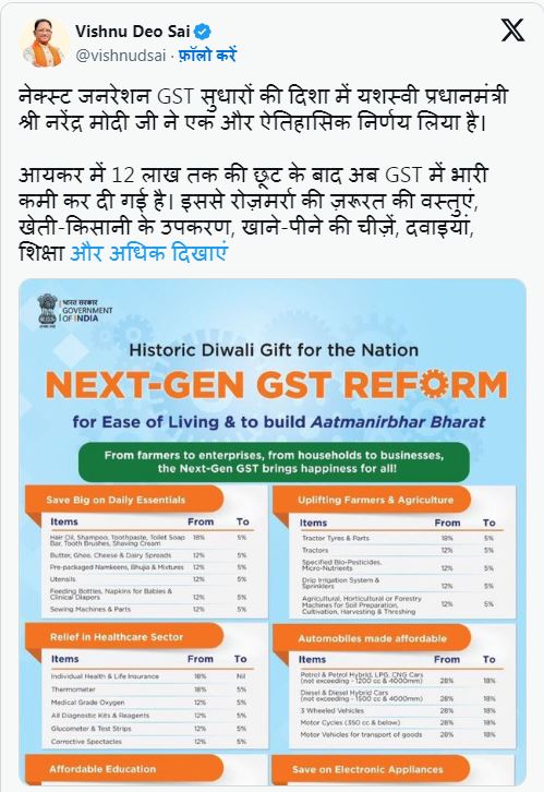 आयकर छूट के बाद अब जीएसटी सुधार से मिलेगा दोहरा लाभ - CM साय