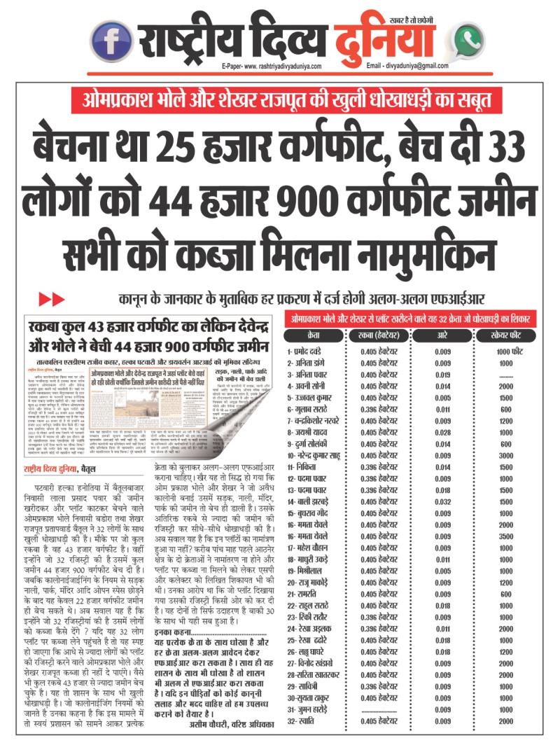 (बैतूल) ओमप्रकाश भोले और शेखर राजपूत की खुली धोखाधड़ी का सबूत , - बेचना था 25 हजार वर्गफीट बेच दी 33 लोगों को 44 हजार 900 वर्गफीट जमीन, सभी को कब्जा मिलना नामुमकिन
