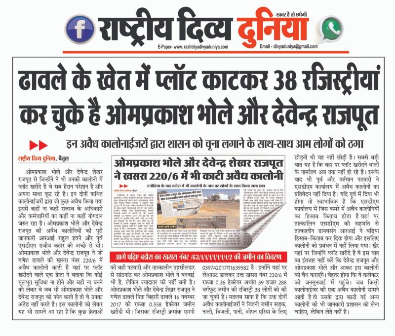 (बैतूल) ढावले के खेत में प्लॉट काटकर 38 रजिस्ट्रीयां कर चुके है ओमप्रकाश भोले और देवेन्द्र राजपूत , - इन अवैध कालोनाईजरों ने शासन को चूना लगाने के साथ-साथ आम लोगों को भी ठगा
