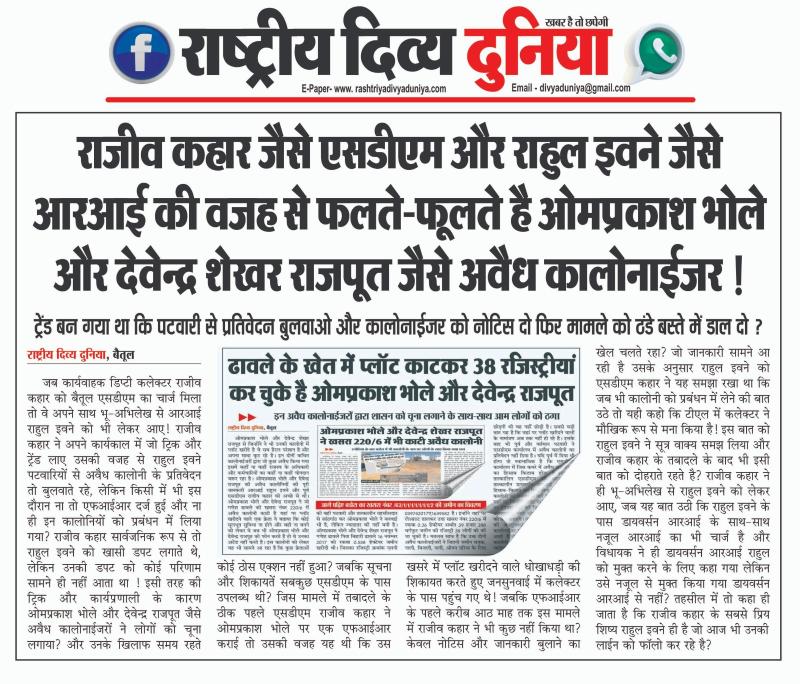 (बैतूल) राजीव कहार जैसे एसडीएम और राहुल इवने जैसे आरआई की वजह से फलते-फूलते है ओमप्रकाश भोले और देवेन्द्र शेखर राजपूत जैसे अवैध कालोनाईजर..! , - ट्रेंड बन गया था कि पटवारी से प्रतिवेदन बुलवाओ और कालोनाईजर को नोटिस दो फिर मामले को ठंडे बस्ते में डाल दो..?
