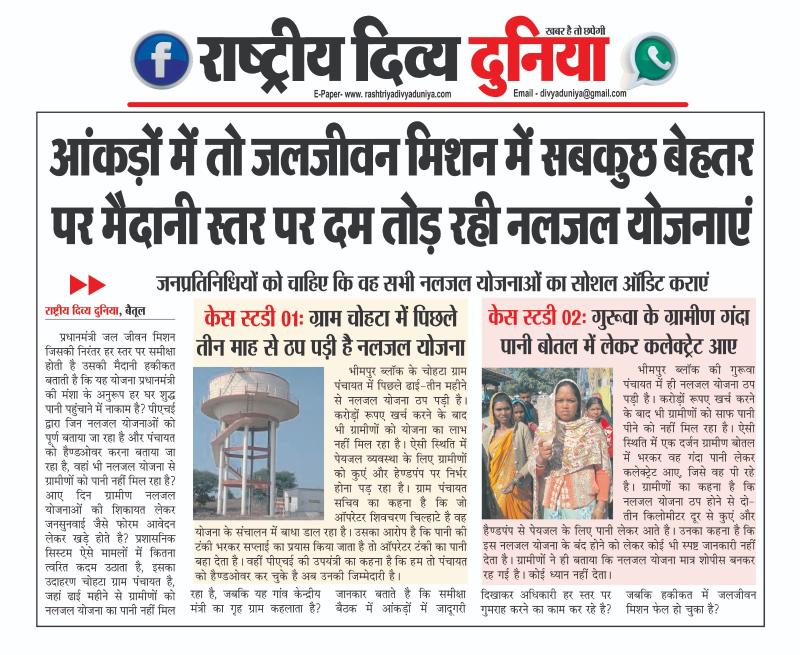(बैतूल) आंकड़ों में तो जलजीवन मिशन में सबकुछ बेहतर पर मैदानी स्तर पर दम तोड़ रही नलजल योजनाएं , - जनप्रतिनिधियों को चाहिए कि वह सभी नलजल योजनाओं का सोशल ऑडिट कराएं