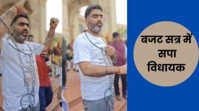 यूपी में बजट सत्र में सपा का प्रदर्शन, विधायक हाथ पैरों में जंजीर पहने दिखे